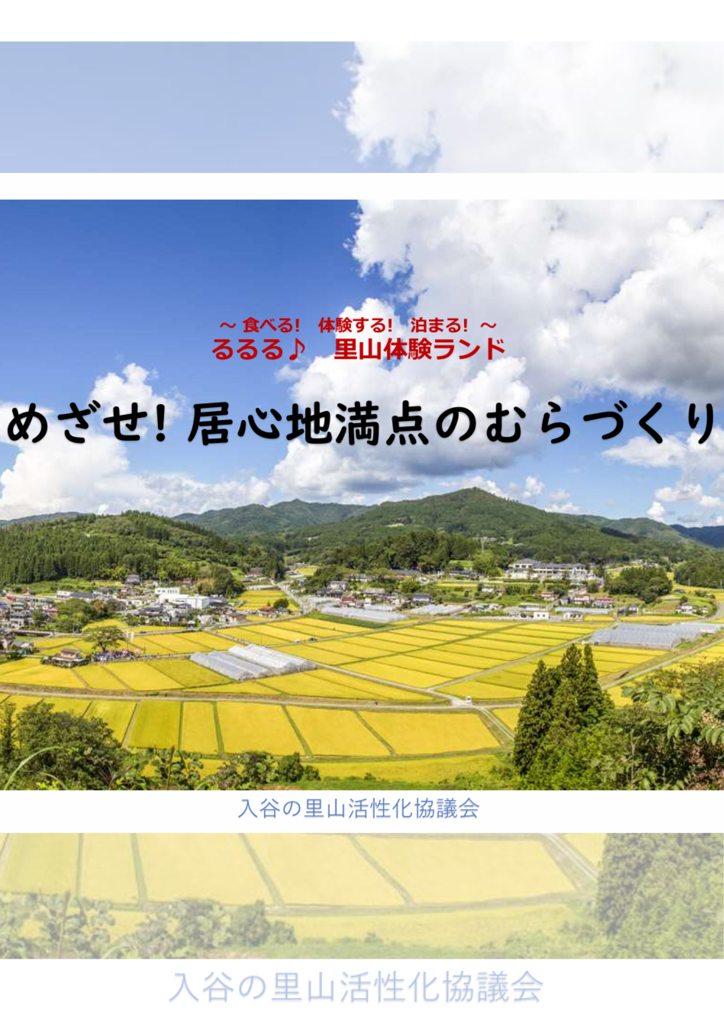 ⼊⾕の⾥⼭活性化協議会は、⼊⾕地区の賑わい創出と発展を⽬指し、⾥⼭整備や⼈材育成に取り組みながらも、グリーンツーリズムや教育旅⾏等の体験プログラムの開発・整備・提供等を地域⼀丸となって実践する協議会です。