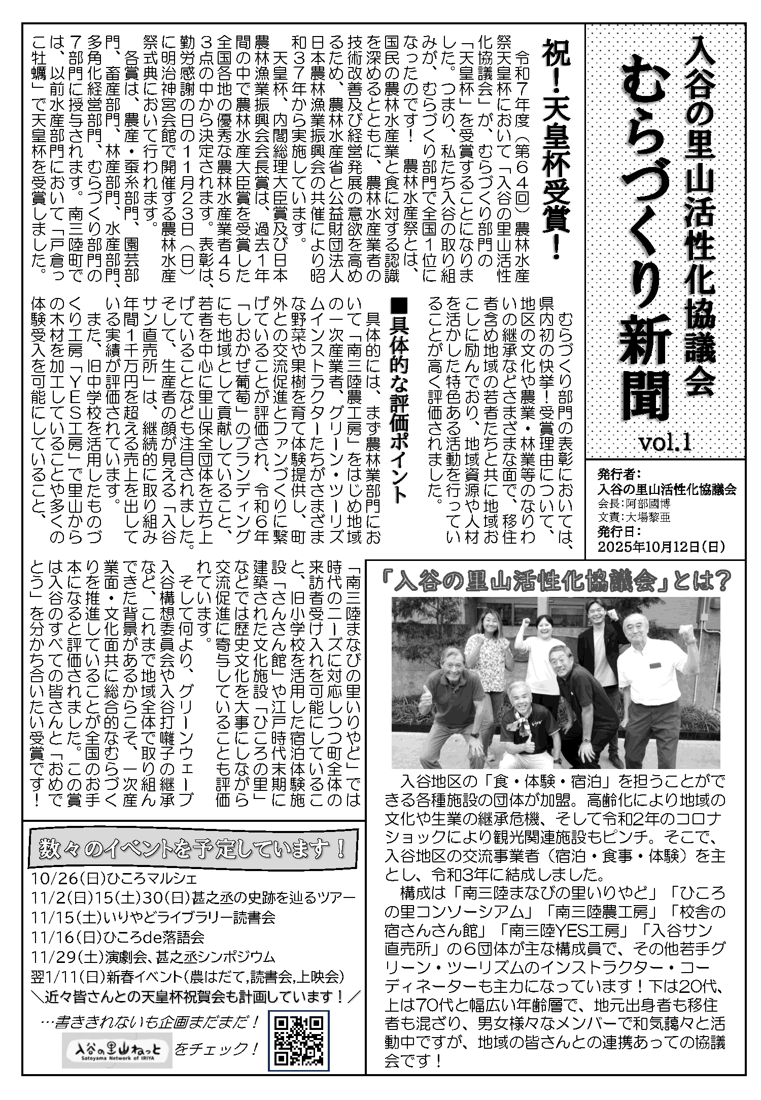 入谷の里山活性化協議会が「むらづくり部門」の天皇杯を受賞しました。